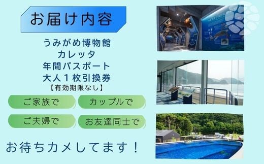 ~ふるさと納税で年パスが手に入る!~ 徳島県美波町の「日和佐うみがめ博物館カレッタ」は、ウミガメの生態や保護活動を学べる全国でも珍しい専門博物館です。 2年間の休館を経て、徳島県美波町の「日和佐うみがめ博物館カレッタ」が2025年7月19日に全館リニューアルオープン! ◎入館券年間パスポート 【大人1名分】 火曜日〜日曜日 9時~17時 定休日 月曜日 ※月曜が祝日の場合翌日が休館日 ※季節により変動あり ※施設点検、気象状況などにより、臨時休業する場合あり リニューアルされた施設をご覧いただき、ウミガメたちと触れ合ってみませんか? 【新しくなったカレッタの見どころ】 ★大亀プール(新設) アニマルウェルフェアに配慮した、ウミガメがより自然に過ごせる最新型プール。 ★学べる展示コーナーも充実! カメの進化をたどる「カメの進化」、町との歴史を描く「ウミガメと共に歩んだ町」、ゲームで学ぶ「環境問題とウミガメ」、保護活動への参加方法を紹介する「ウミガメの調査活動」など、楽しみながら学べる展示が盛りだくさん。 【ふるさと納税でカレッタを応援しよう】 本返礼品を通じたご寄付は、美波町のウミガメ保護活動、教育普及、アニマルウェルフェアの実現などに役立てられます。 自然との共生、未来への継承。 あなたのご支援が、ウミガメと町の未来をつなぎます。
